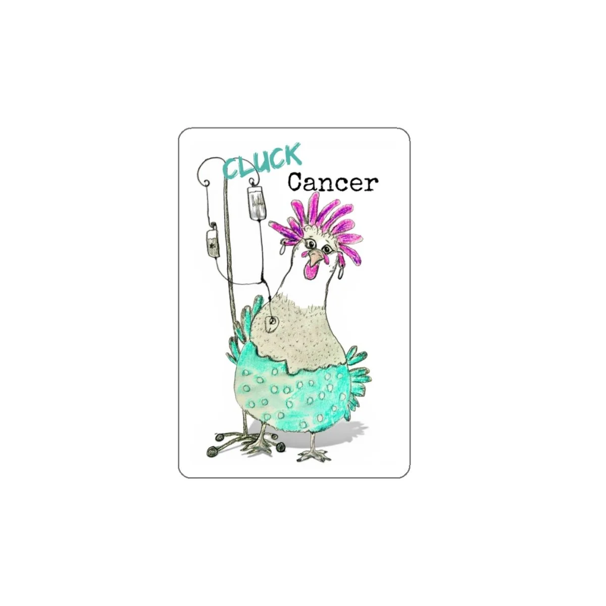 Bright, brave, and a little bit stubborn — this matte die-cut sticker features a hand-drawn, sassy chicken hooked up to IV bags with the cheeky wording “CLUCK Cancer.” The watercolor-style teal and magenta palette keeps the tone uplifting while honoring resilience. Stick it to a laptop, water bottle, journal, or chemo-care package to add a dash of humor and solidarity. The matte finish and UV laminate keep colors soft and protected outdoors, while the easy-peel backing means you can place it quickly on smooth surfaces like glass or metal.